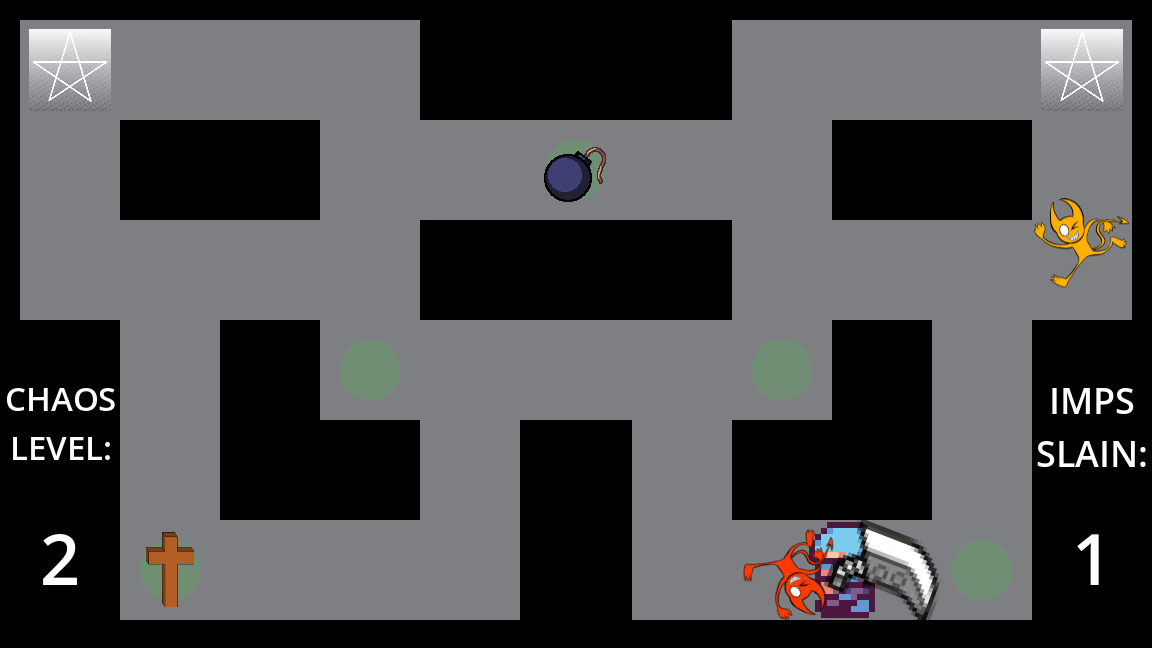 A little game where you walk around a tiny maze, picking up items and using them to kill imps. Use WASD or the arrow keys to move, and press Space to use the items you pick up.